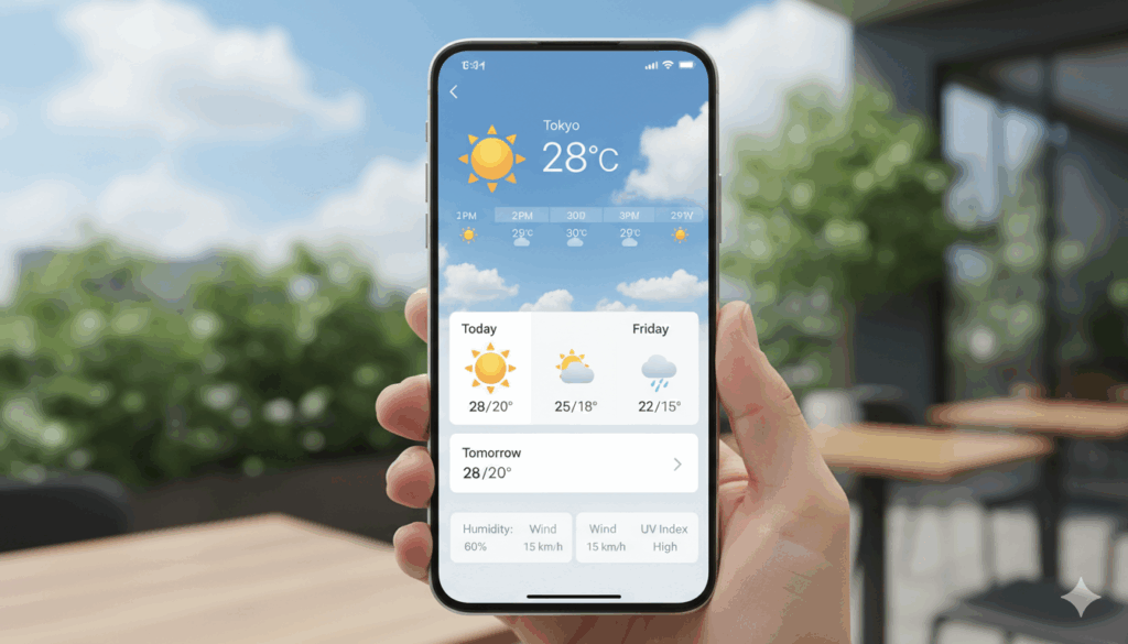 天気予報アプリ(=お客さん)は、数分おきに、そのAPIに「東京の今日の天気を教えてください」と、決められたルールで注文(リクエスト)をします。すると、APIが気象情報会社のシステムから最新のデータ(=料理)を持ってきて、「はい、東京は晴れ、最高気温25度です」と返してくれます(レスポンス)。